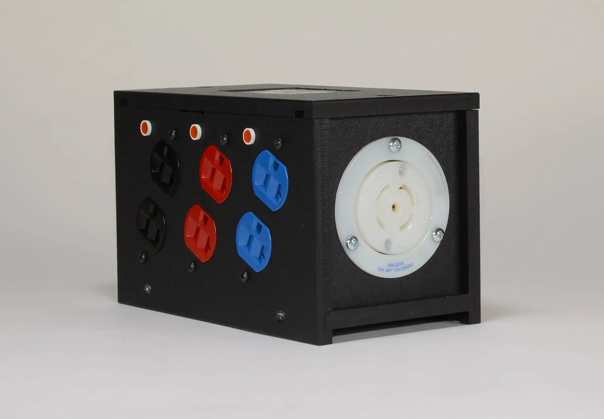 Input: 30A 208/120V AC 4P/5W (NEMA L21-30) Twist Lock; Pass Thru: 30A 208/120V 4P/5W (NEMA L21-30) Twist Lock; Outputs: (3) 20A 120V AC 2P/3W (NEMA 5-20) phase color coded (Black – X; Red – Y; Blue – Z) duplex receptacles with phase indicator lights.  Branch Circuit Protection: (3) Single Pole 20A Hydraulic Magnetic Breakers mounted directly opposite the Edison on the other side.