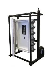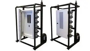 Enclosure is a steel all welded enclosure with Hinged removal front door with viewing window to check breaker status. Enclosure is fully gasketed, powder coated, mounted on an all steel powder coated frame with pneumatic 10 inch wheels for rugged terrain and lift hooks when lifting into place is required.